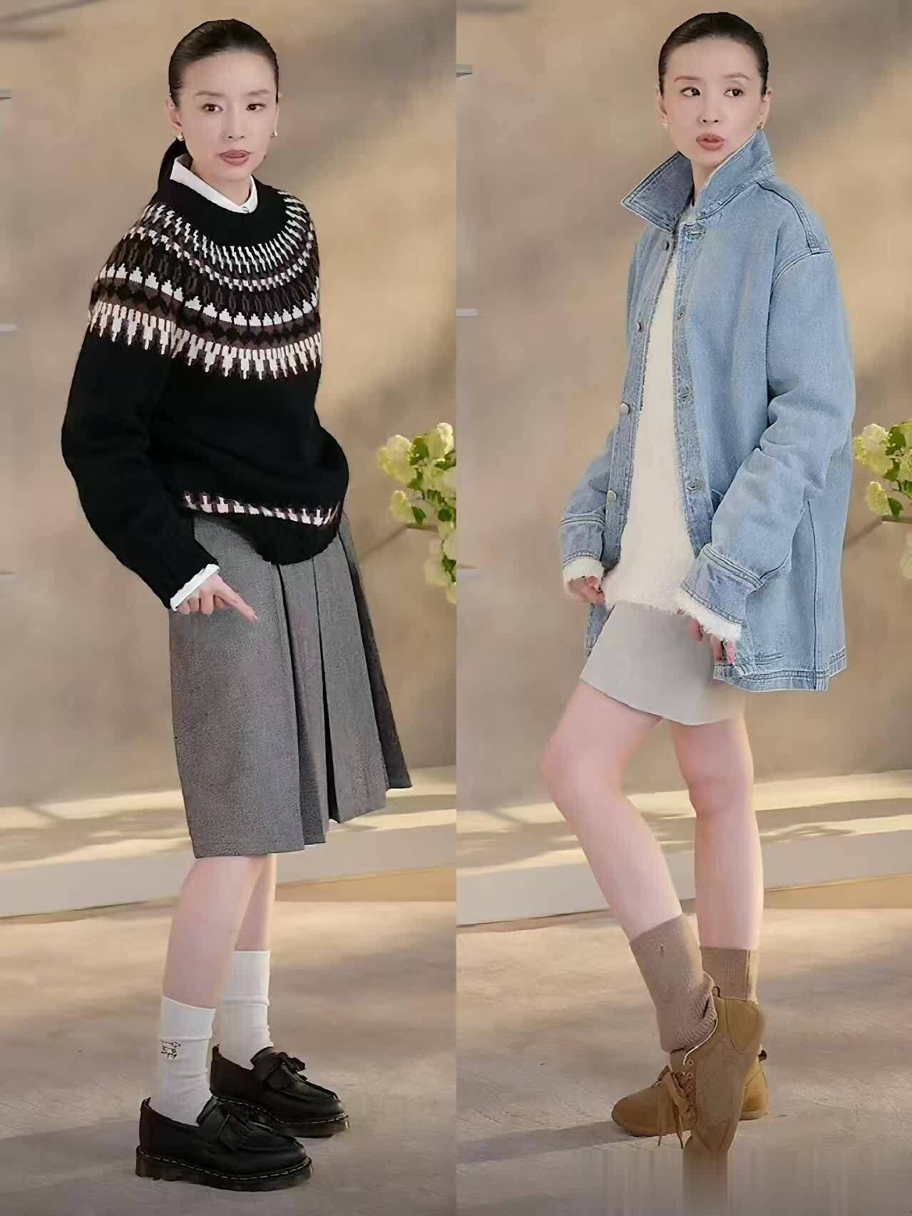 中间那套马甲叠穿绝了!浅灰针织马甲配同色系厚卫衣,领口露出两指白边,下身是加绒运动裤,脚踩中筒靴,脚踝套着米白袜套——三层保暖愣是穿出了层次感,一点不显得臃肿。她现场扯了扯卫衣下摆,说“这料子贴身穿不扎,洗了也不变形”,旁边放着的耳罩更让人眼熟,米白色毛茸茸的,她笑着说“这是戴了两年的老伙计,冷风吹着不冻耳朵”,果然是把实用主义刻进骨子里,选的都是能穿很久的物件。